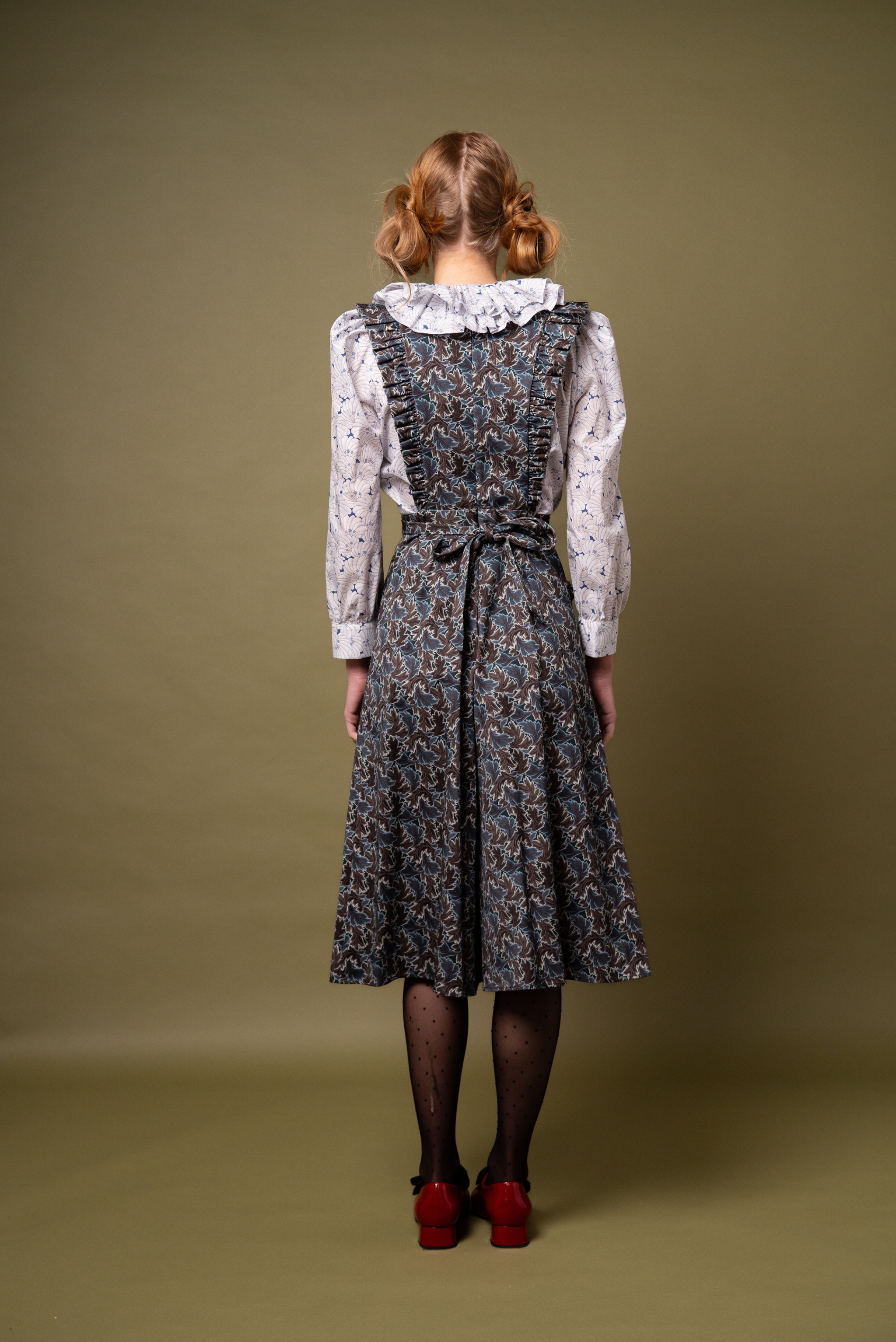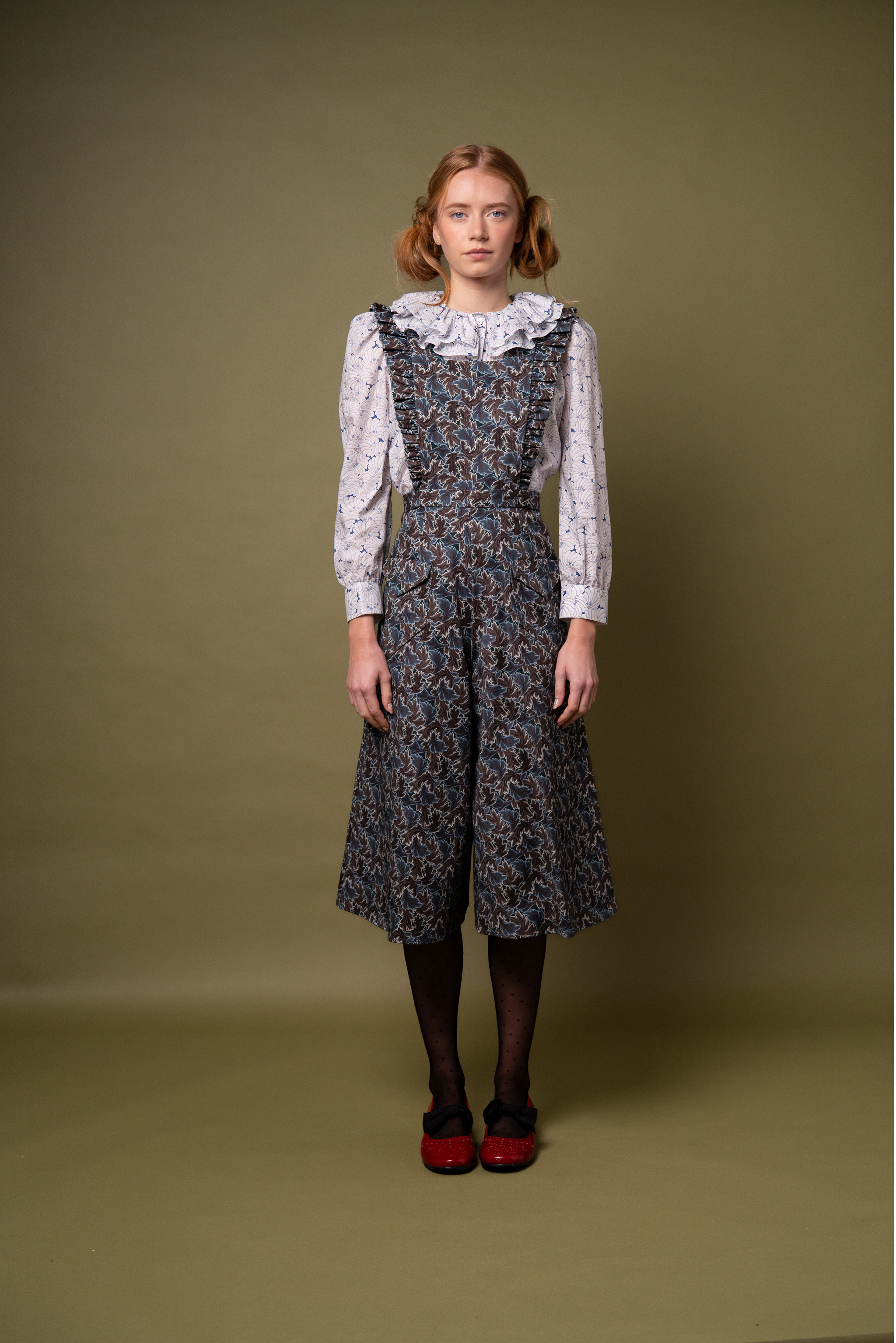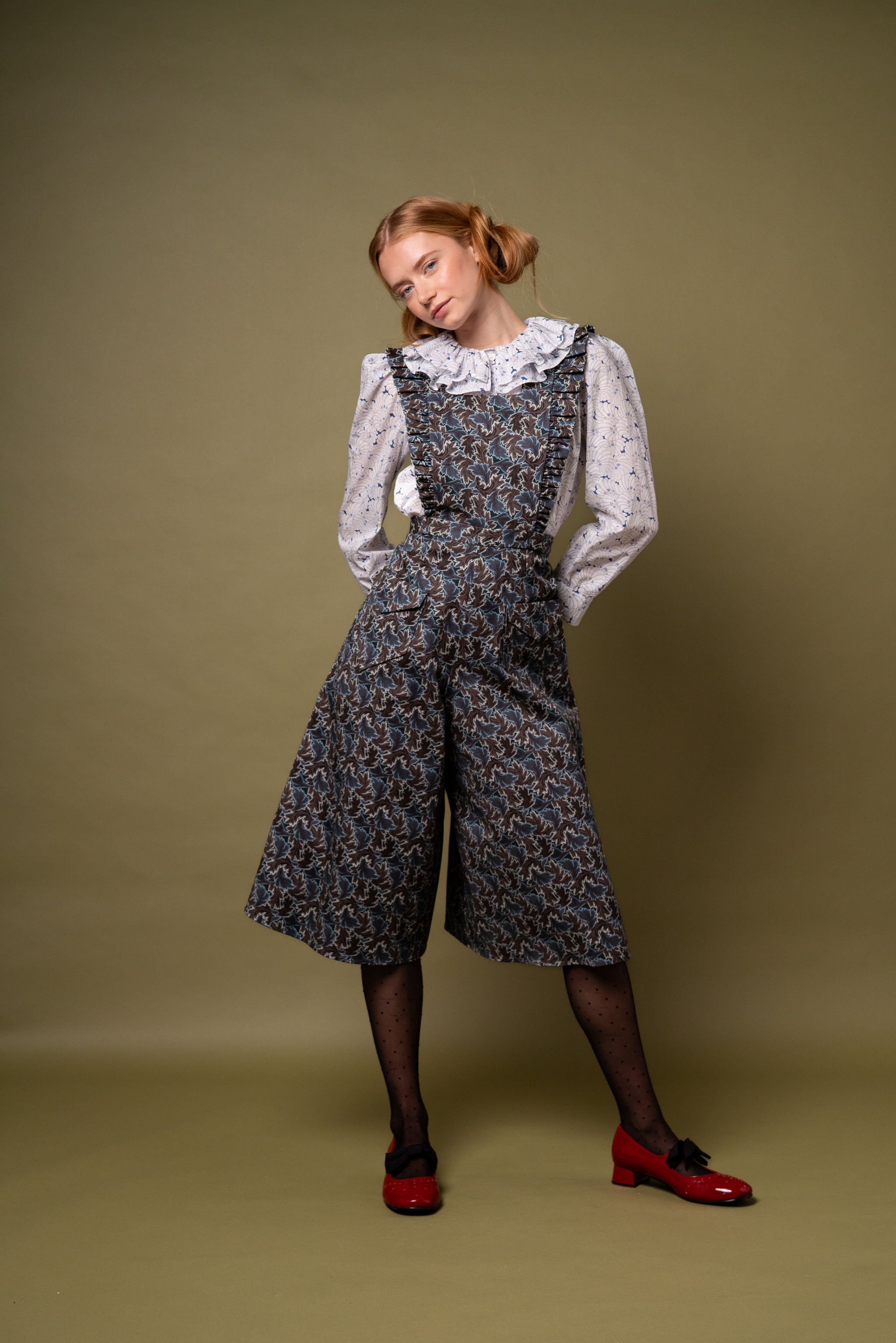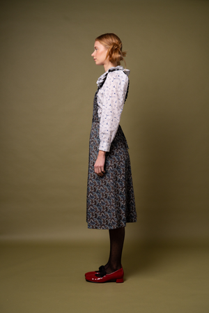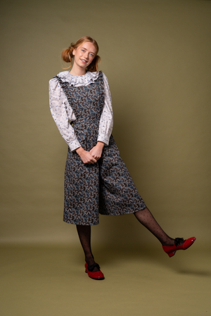 The Janine features below-the-knee culotte-style trousers, patch pockets and a sweet apron-style top with a subtle frill. Its flattering high-waist design pairs beautifully with our flirty and whimsical Pierrot Blouse, our Greta Jumper, or a polo neck skinny rib.