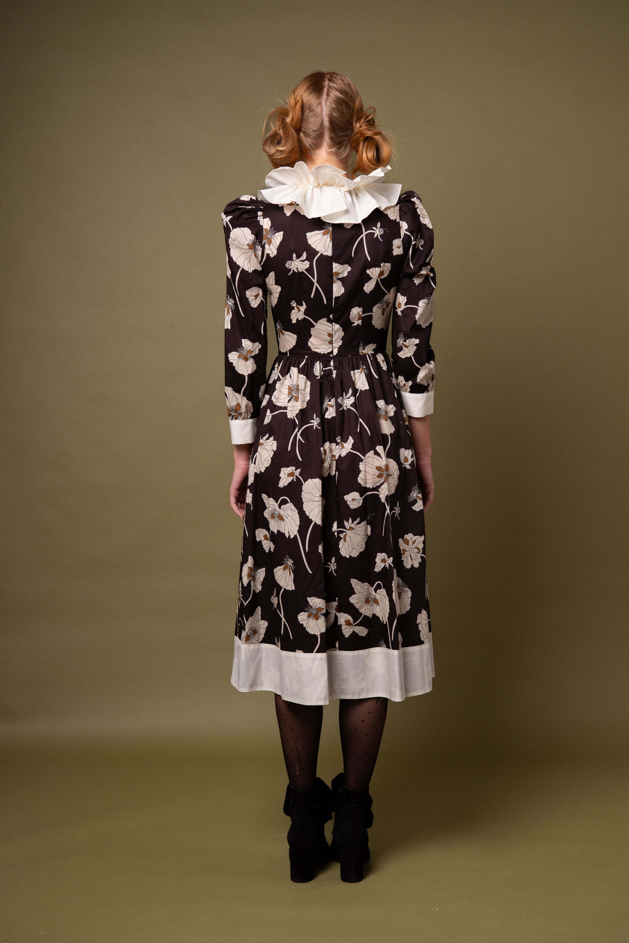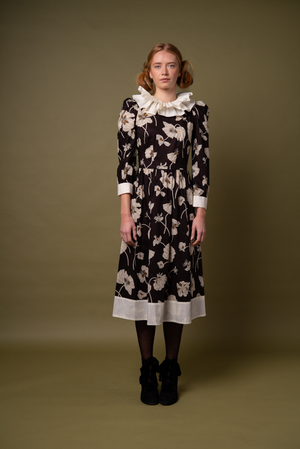 Here in a stunning large floral 'Fragile Blooms' Liberty print Tana Lawn cotton with an ivory cotton contrast double ruffle collar, plain cuff and hem detail.