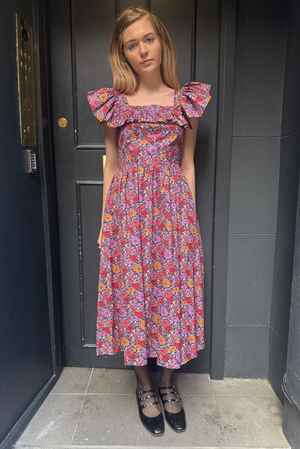 Here in a gorgeous lilac Liberty 'Meadow Song' Tana Lawn cotton, with fitted and lined bodice, squared neckline with ruffle, below the knee gathered skirt and large side pockets.